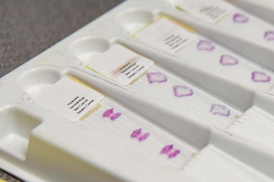 Skin cancers are removed in small sections, one layer at a time. The removed tissue is examined under the microscope, in our state-of-the-art high-complexity tissue processing laboratories, to precisely map out any remaining tumor to be removed.